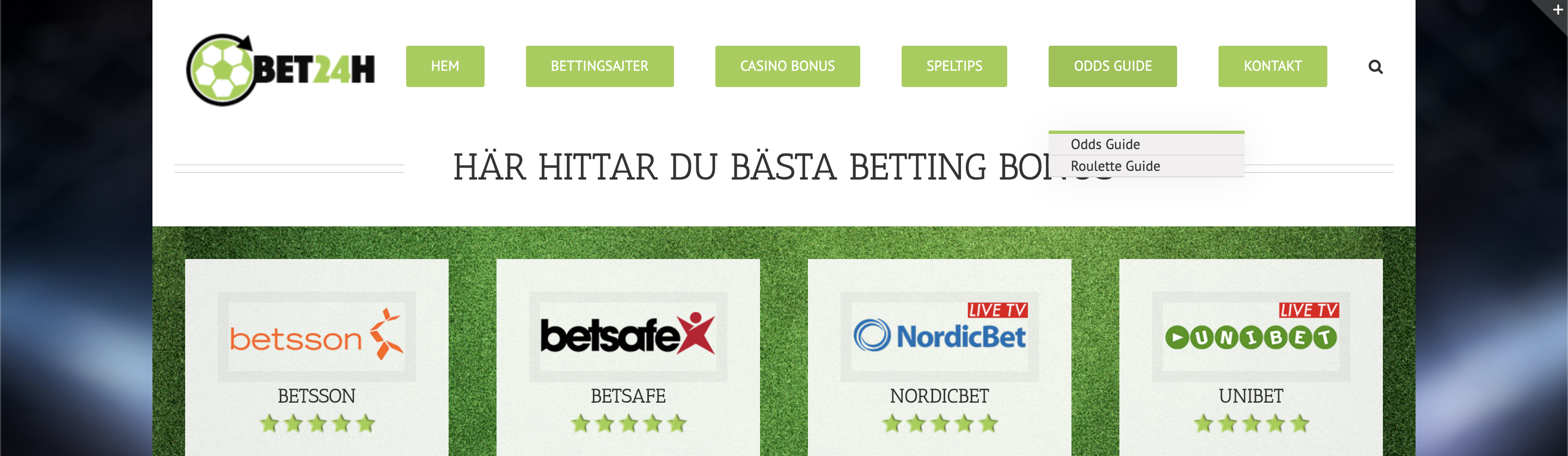 Här har vi en äkta legend på marknaden. Bet24h.se som kombinerar både casino och betting på nätet. Välj bland dina favoriter när det kommer till Svenska spelbolag som erbjuder betting och casino. Till Svenska spelare! Här kan du läsa recensioner om casinosajter och bettingsajter, betting tips, guider, och annan bra information att veta när du spelar på internet.